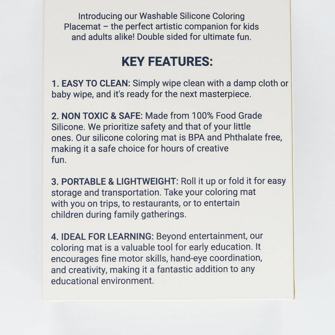 Eco-Friendly and Reusable: Say goodbye to wasteful paper and endless clutter. Our coloring mat is made from high-quality, food-grade silicone that's not only durable but also environmentally responsible. It's built to last, allowing you to use it over and over again, reducing your carbon footprint.