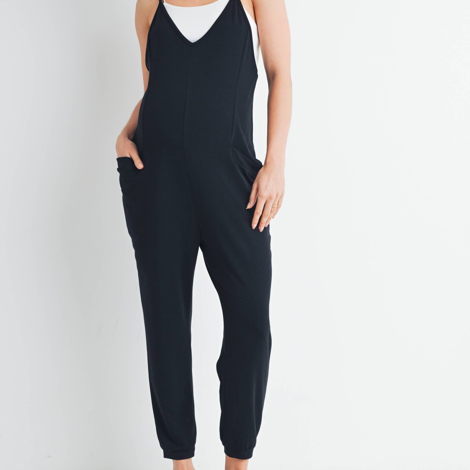 V-Neck Sleeveless Maternity Jogger Knit Jumpsuit with Front Pockets  48% Rayon, 48% Polyester, 4% Spandex Care Instruction: - Machine Wash Cold Water - Hang Dry In seam: 21''