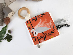 Charley Harper bird fabric crinkle toys, striking high contrast prints, perfect for boy or girl gifting. Attached to these is a wood teething ring and knotted, handmade fabric tabs for little fingers to twirl and gums to gnaw. Machine washable, always a plus, just remove wood ring first. Babies love this crinkle! crinkle lovey: 5 inch square ring: 2.5 inch